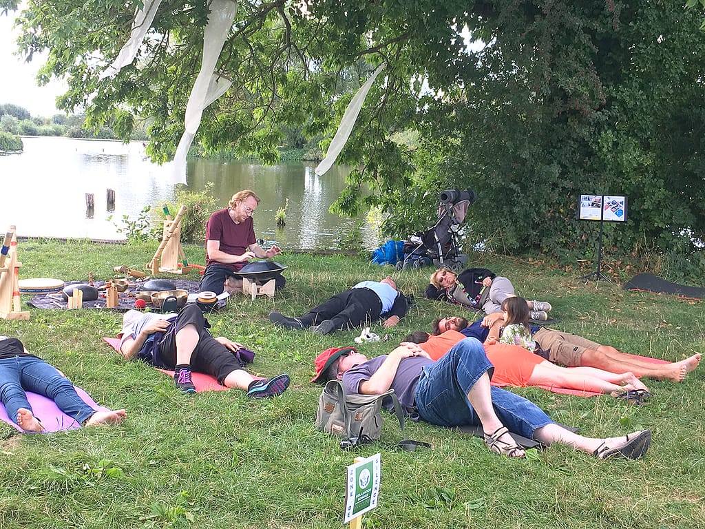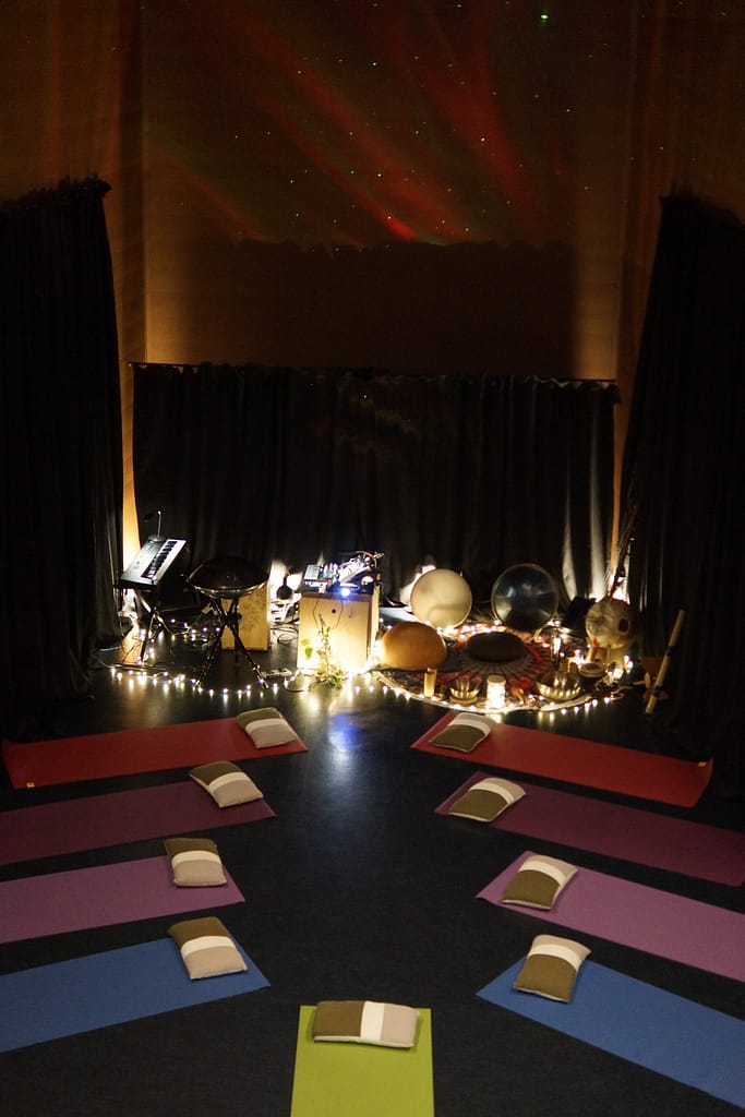 Lors d’un voyage sonore immersif, les participant·e·s sont invité·e·s à s’installer confortablement au sol, en posture allongée, sur tapis, avec coussin et couverture.