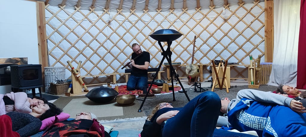 Le voyage sonore est réalisé avec différents instruments de musique vibratoires et intuitifs : Rav Vast, HandPan, N’Goni, flûtes, bols chantants tibétains, sansula, tambour de mer, didgeridoo, …